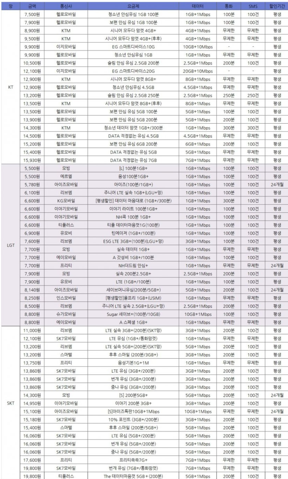 메뚜기 등 잦은 번호 이동 귀찮으신 저같은 분들을 위한 오늘 기준 알뜰폰 20개 통신사의 평생 또는 24개월